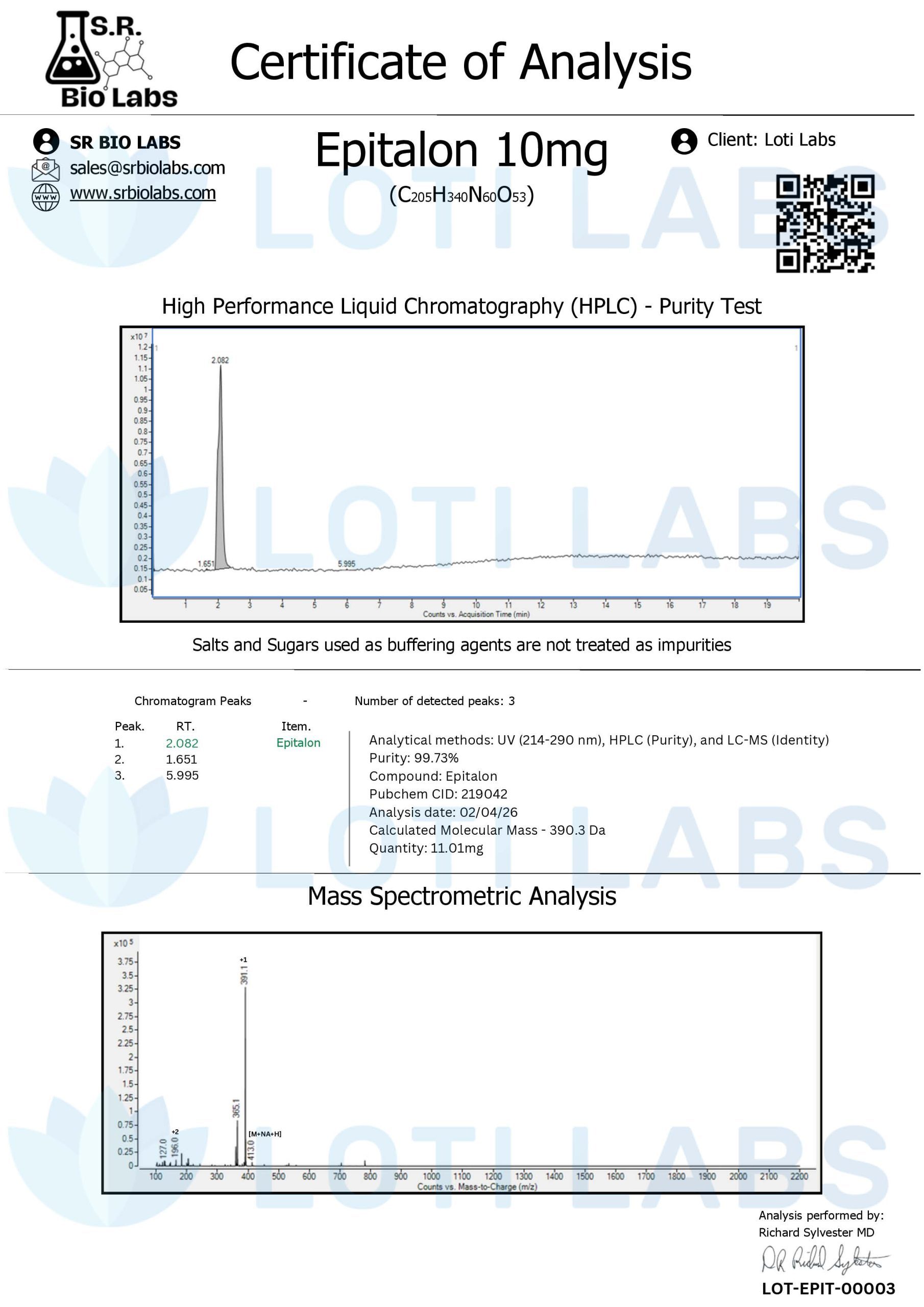 Epitalon 10mg comes as a lyophilised powder. Since it is a small tetrapeptide, it’s highly water-soluble and reconstitutes easily in sterile water or saline. Store reconstituted solutions at 4°C for short-term use or −20°C for longer storage. The lyophilised powder itself is stable at −20°C for extended periods. Purity by HPLC is typically ≥98% for this research-grade material.