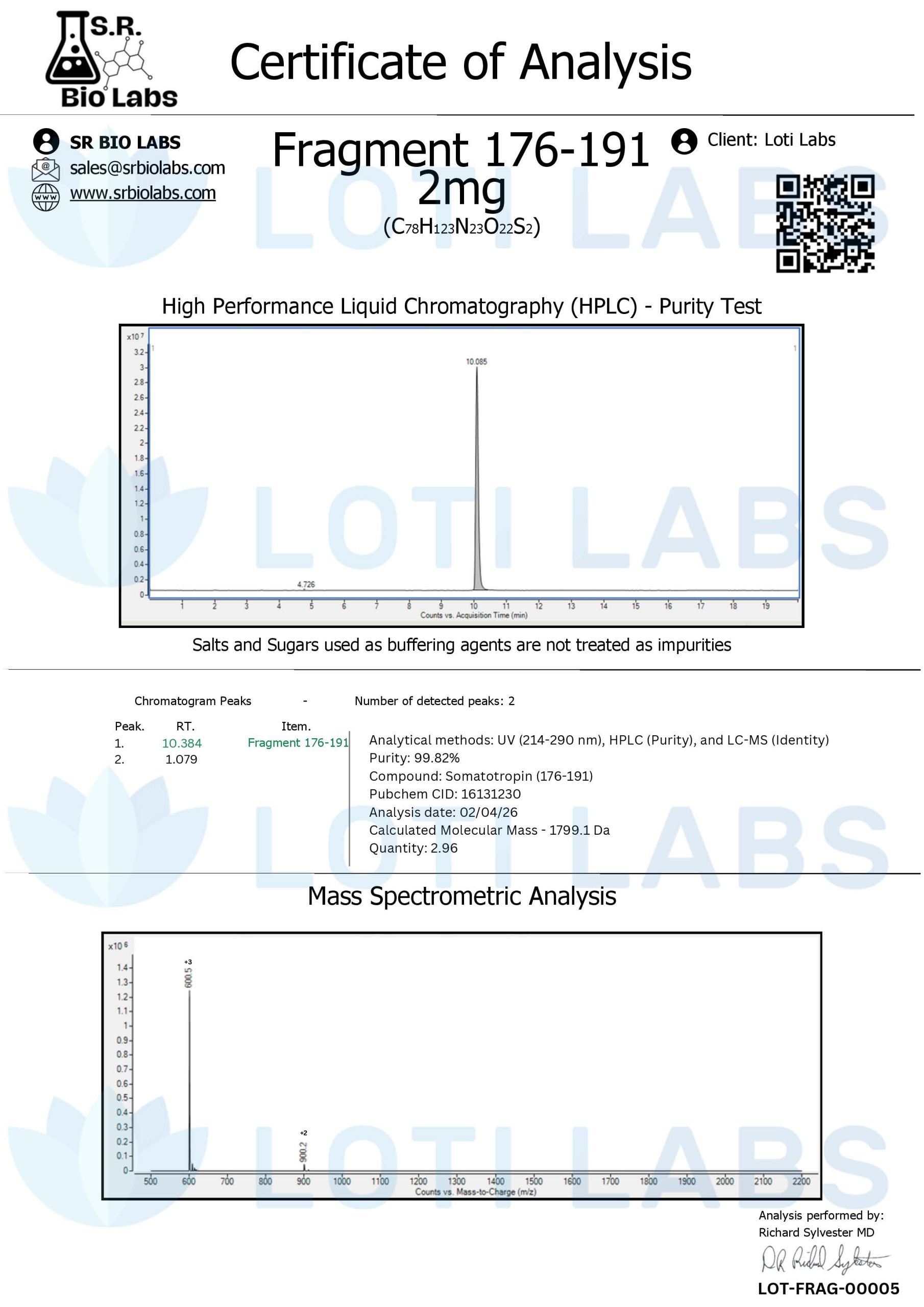 We supply Fragment 176-191 2mg as a lyophilised white powder. Research teams typically use sterile bacteriostatic water for reconstitution. Once reconstituted, the solution should be kept at 4°C and used promptly; the lyophilised material should be stored at −20°C. It maintains an HPLC purity of ≥98% as standard for research-grade material. It is also moderately water-soluble under physiological pH conditions.