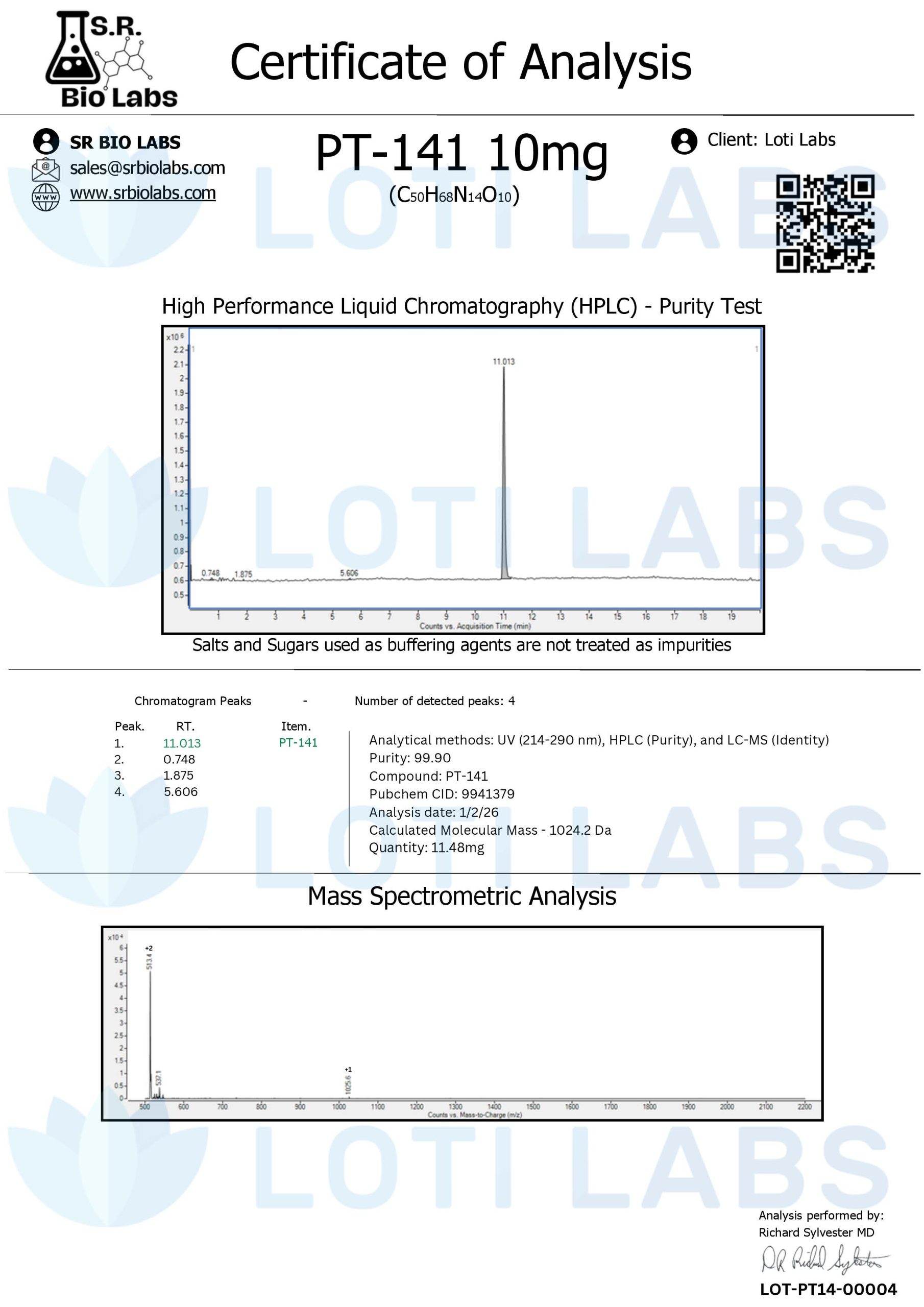 Skip to contentPT-141 (Bremelanotide) is a synthetic melanocortin receptor agonist derived from Melanotan II. It has been studied in preclinical models for its interactions with MC3R and MC4R receptors, with research focusing on CNS-mediated signalling pathways related to autonomic and neuroendocrine function. Supplied as a lyophilised powder for qualified laboratory research use only.